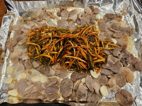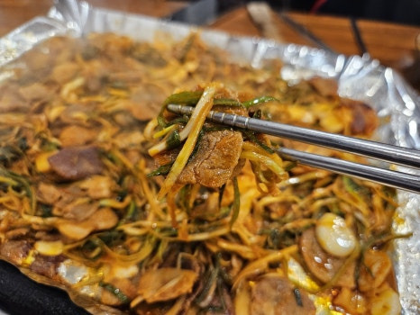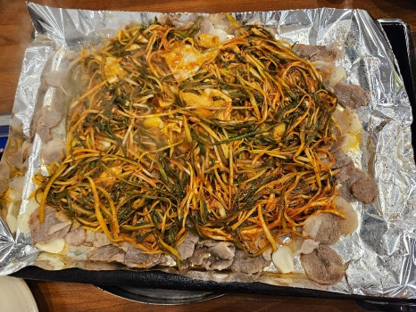돼지고기: 이곳의 대표 메뉴로, 고기를 불판에 구워서 먹는 요리입니다. 부드러운 식감과 깊은 맛이 일품이며, 함께 제공되는 파채와의 조화가 매력적입니다.