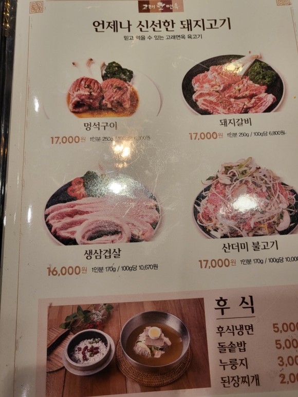 정식: 39,000원 돼지갈비: 17,000원 후식냉면: 5,000원, 후식비빔냉면: 5,000원 후식돌솥밥: 5,000원 가격은 합리적이며, 고기와 식사를 함께 즐길 수 있는 다양한 메뉴를 제공하고 있습니다.