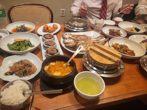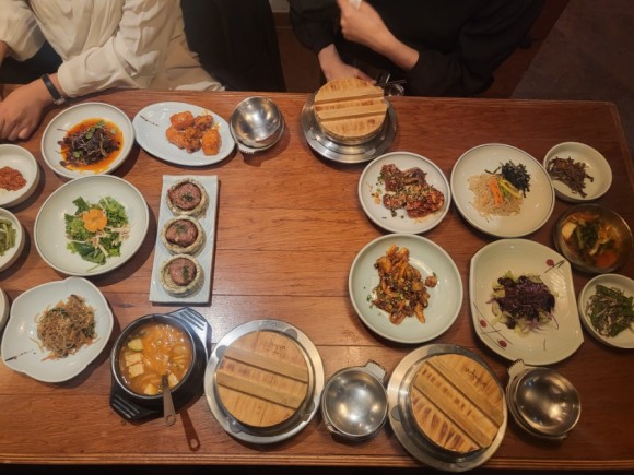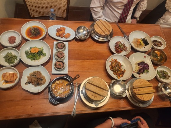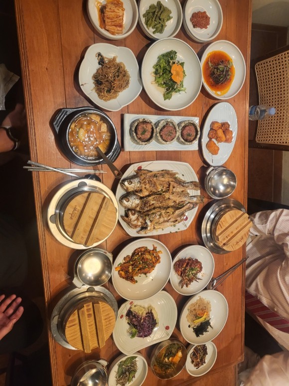 '밥상차려주는집'은 세종시 호수공원 근처에 위치해 있어 식사 후 산책하기에 좋은 장소입니다. 전통 한식 정식을 즐기고 나서 호수공원을 둘러보면 세종 여행의 멋진 추억을 만들 수 있습니다. 또한 이곳은 모두를 위한 무료 홈페이지 서비스 ' bobsangsejong.modoo.at '를 통해 온라인 예약도 가능합니다. 음식이 너무 많고 잘 나와서 사진은 한번에 찍은 사진밖에 없네요. 그래도 반찬 하나하나 깔끔하고 맛있습니다.