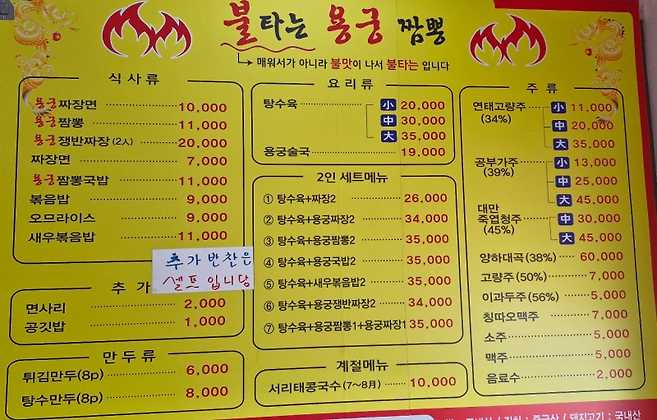 불타는용궁짬뽕의 가장 큰 매력은 그 짬뽕입니다. 매운 국물에 신선한 해산물과 채소가 조화를 이루며, 한 입 먹는 순간 깊고 진한 맛이 입안을 감돕니다. 이곳의 짬뽕은 일반적인 짬뽕과는 달리, 특별한 비법 육수를 사용하여 깊은 풍미를 자랑합니다. 매운맛을 좋아하는 분들에게는 특히 추천할 만한 메뉴입니다. 이곳의 짬뽕은 다양한 해산물로 가득 차 있어, 식사 후에도 그 풍미가 오래 남습니다. 또한, 면발은 쫄깃하고 탄력 있어 국물과 잘 어우러집니다. 짬뽕 외에도 다양한 사이드 메뉴가 있어, 여러 가지 맛을 즐길 수 있습니다.