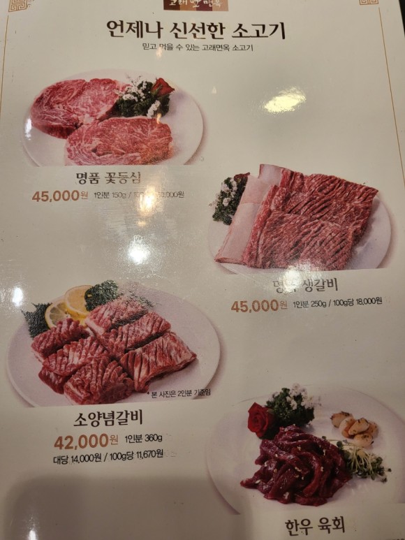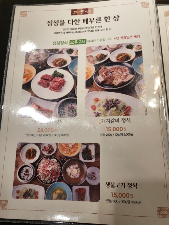 정식: 39,000원 돼지갈비: 17,000원 후식냉면: 5,000원, 후식비빔냉면: 5,000원 후식돌솥밥: 5,000원 가격은 합리적이며, 고기와 식사를 함께 즐길 수 있는 다양한 메뉴를 제공하고 있습니다.