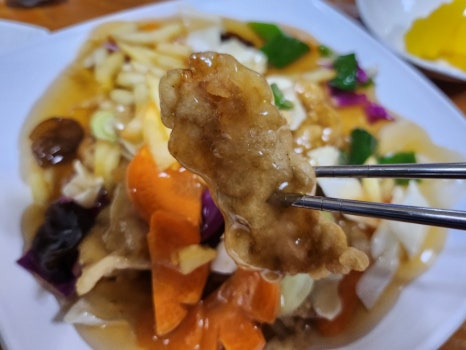 탕수육은 영화반점의 또 다른 인기 메뉴로, 바삭한 튀김옷과 달콤한 소스의 조화가 일품입니다. 고기는 부드럽고 육즙이 가득해, 한 입 먹으면 입 안에서 사르르 녹습니다. 특히, 소스의 새콤달콤한 맛이 중독성이 있어 계속해서 손이 가게 만듭니다.