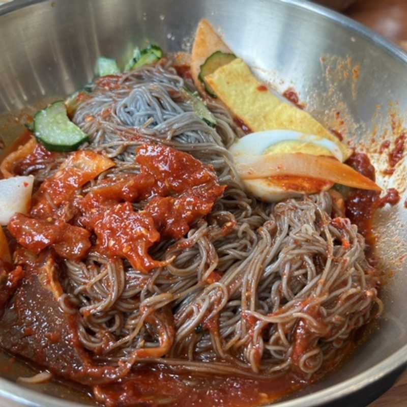 비빔냉면 – 고추장 양념과 배, 오이, 계란, 수육이 어우러진 진한 맛